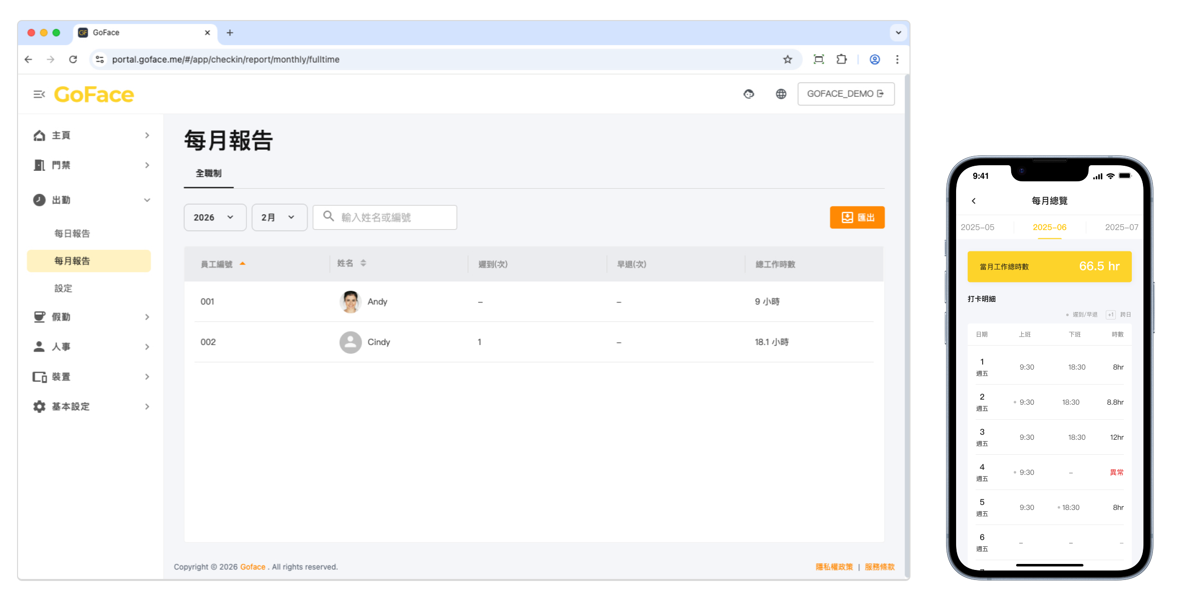 2.在 "每月報告" 或員工至 "APP 每月總覽" 可查看遲到早退相關資訊