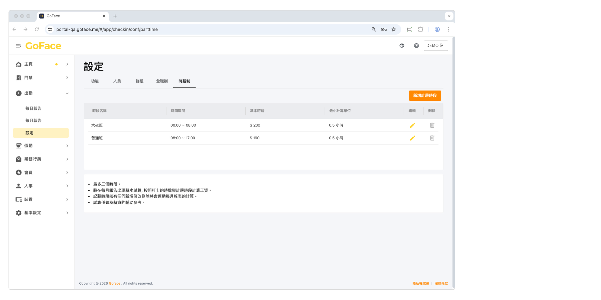 透過 [ 出勤 > 設定 > 時薪制 ] 設定不同時段的基本時薪