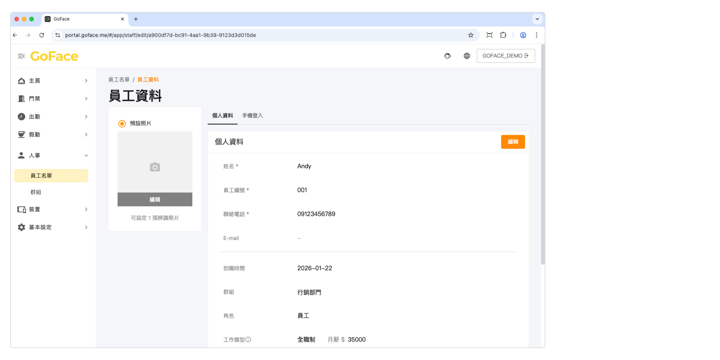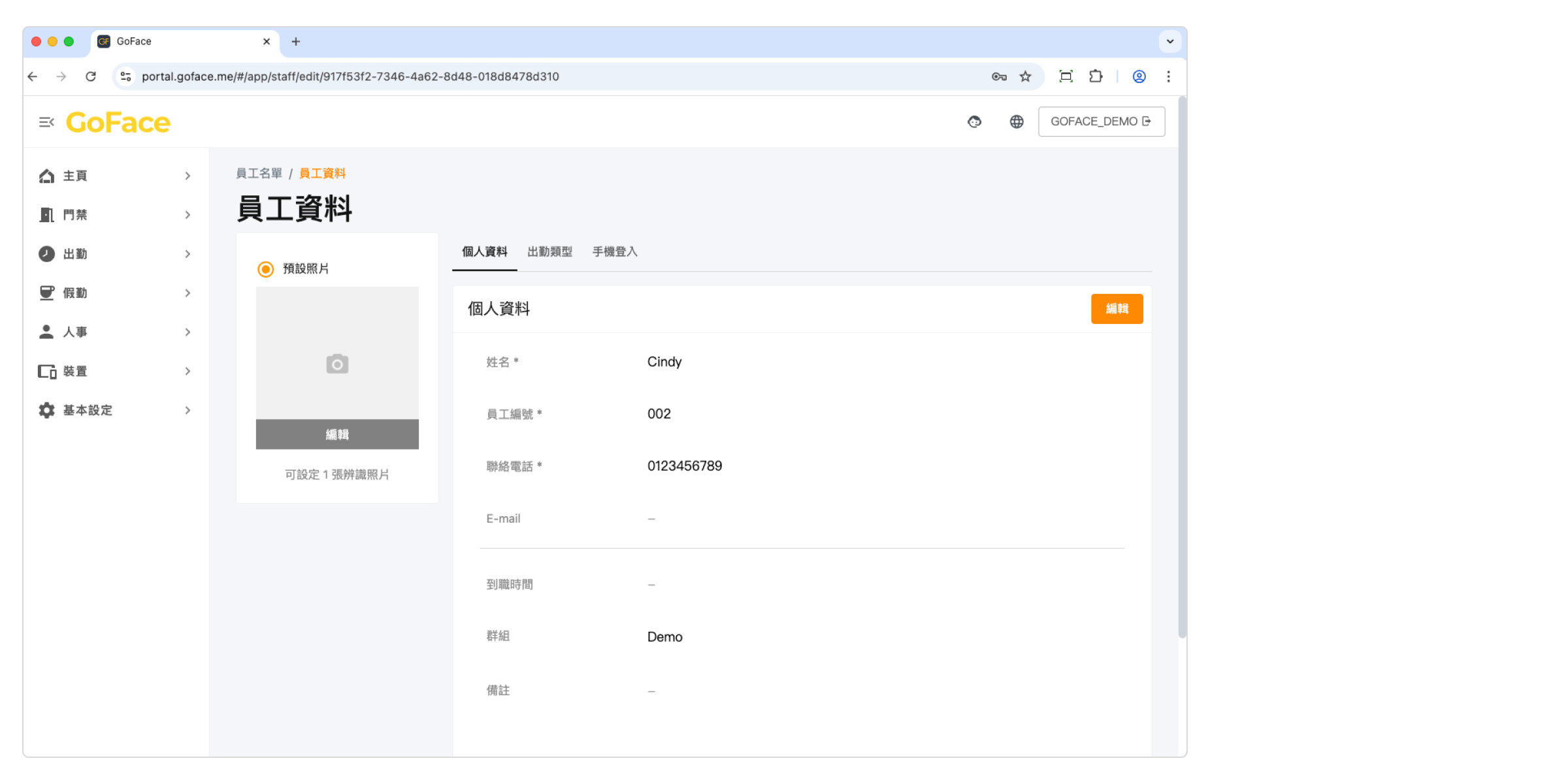 儲存後點擊左側 [編輯] 可上傳臉部辨識照片