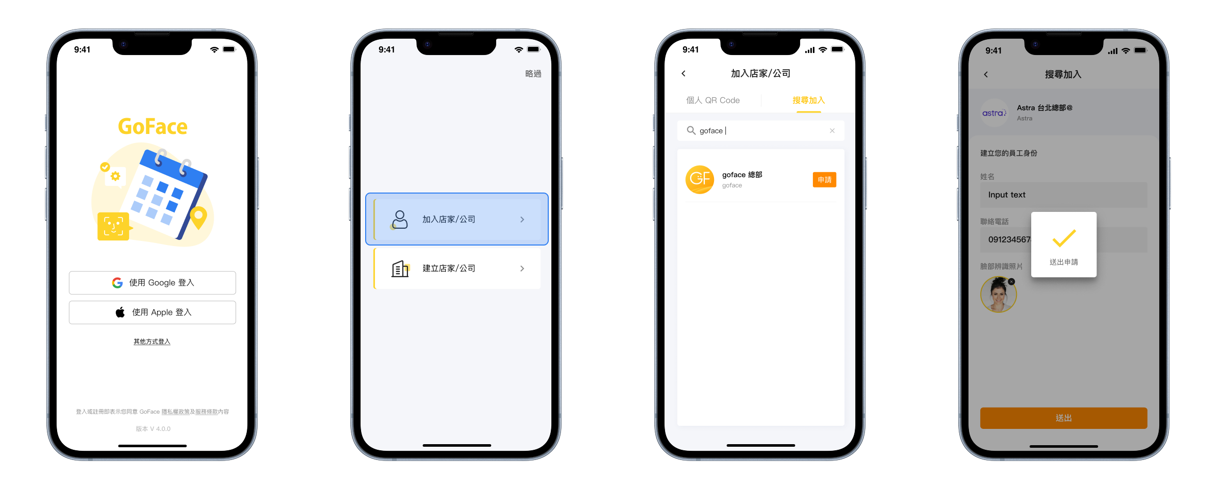 員工至 APP Store 下載APP,透過快速登入註冊個人帳號後,搜尋公司名稱申請加入,待主管審核後完成加入