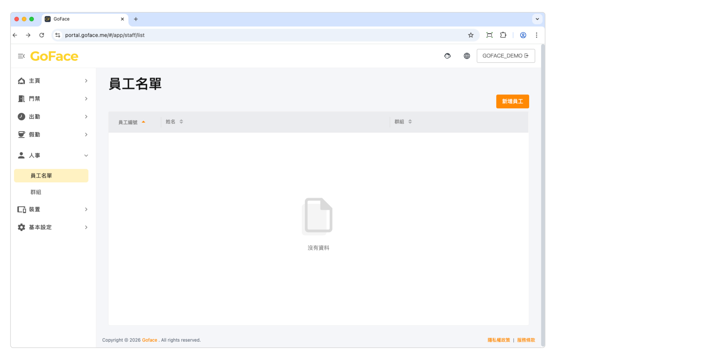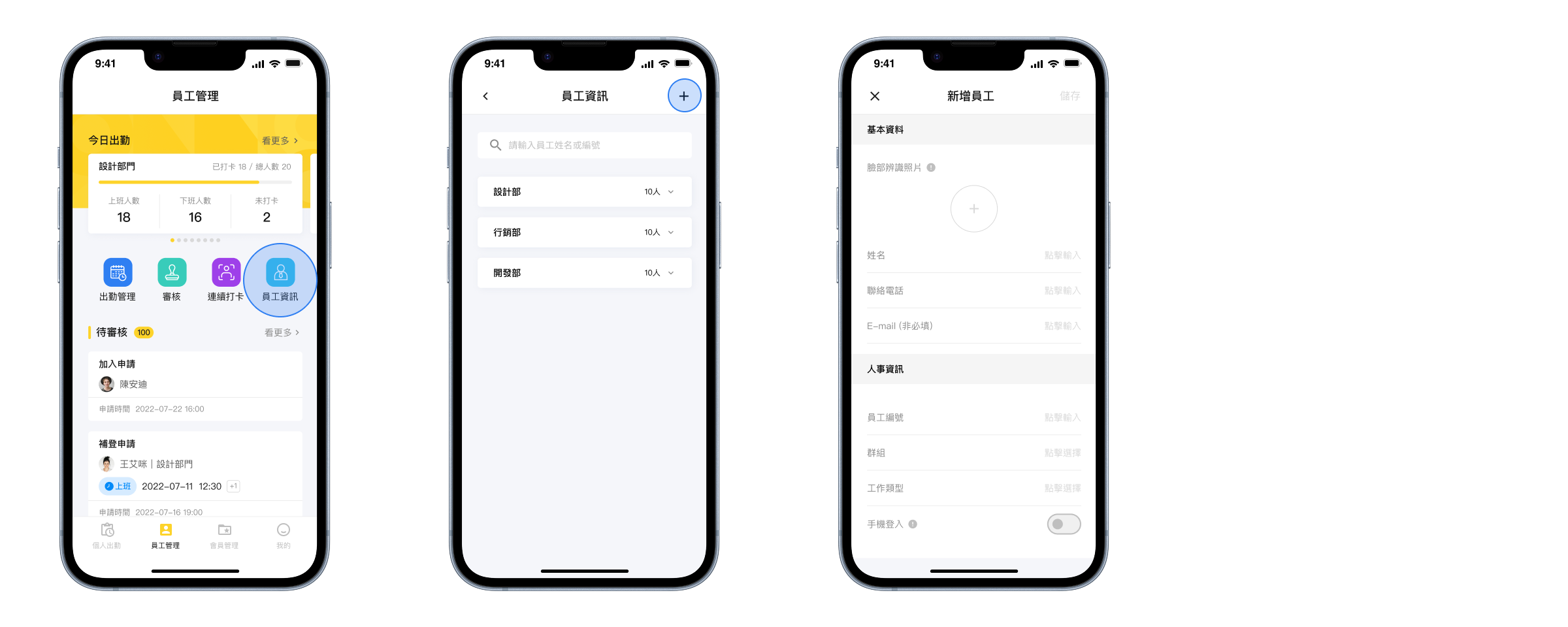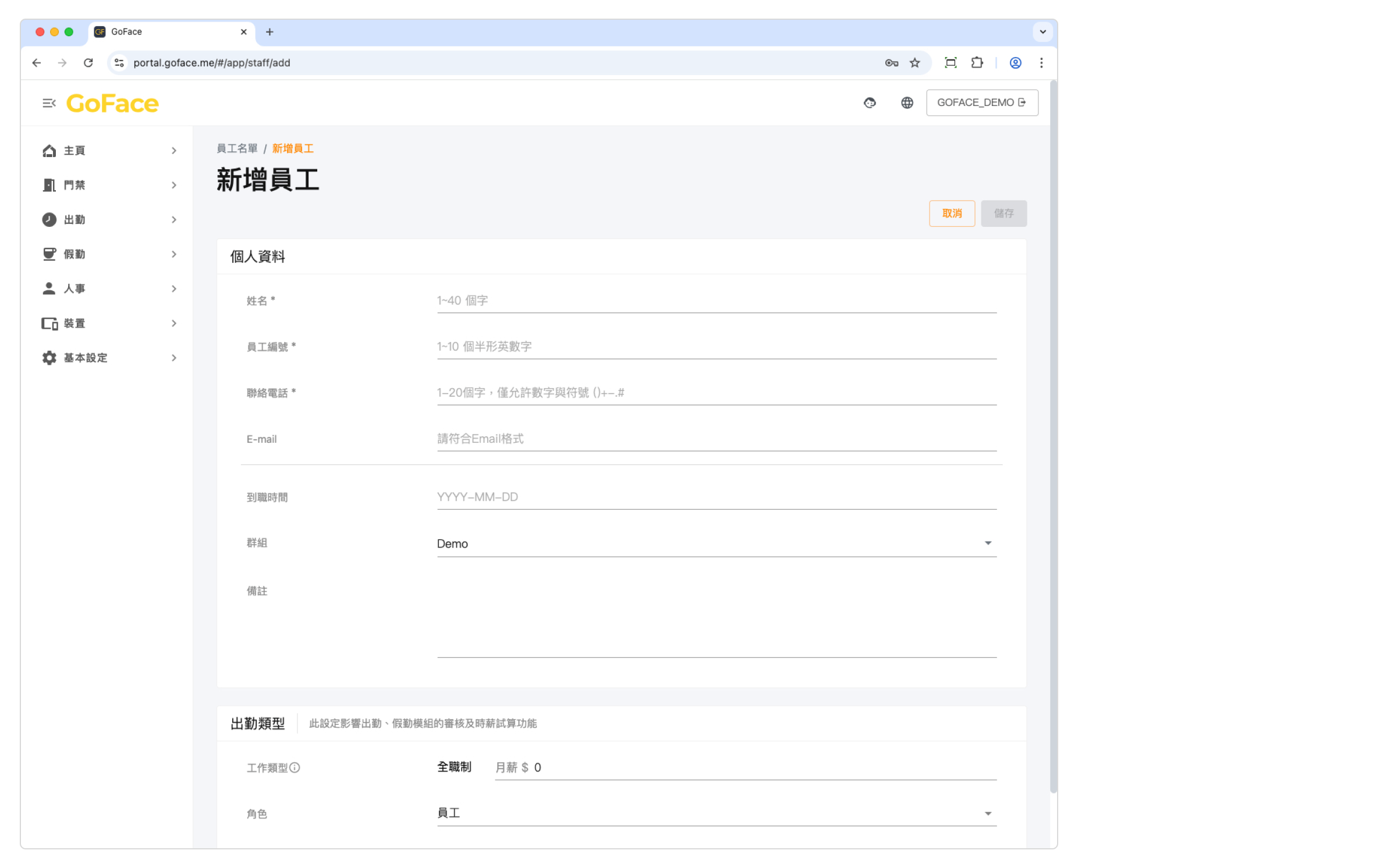 透過 [ 員工管理 > 員工資訊 ] ,點擊 + 新增員工