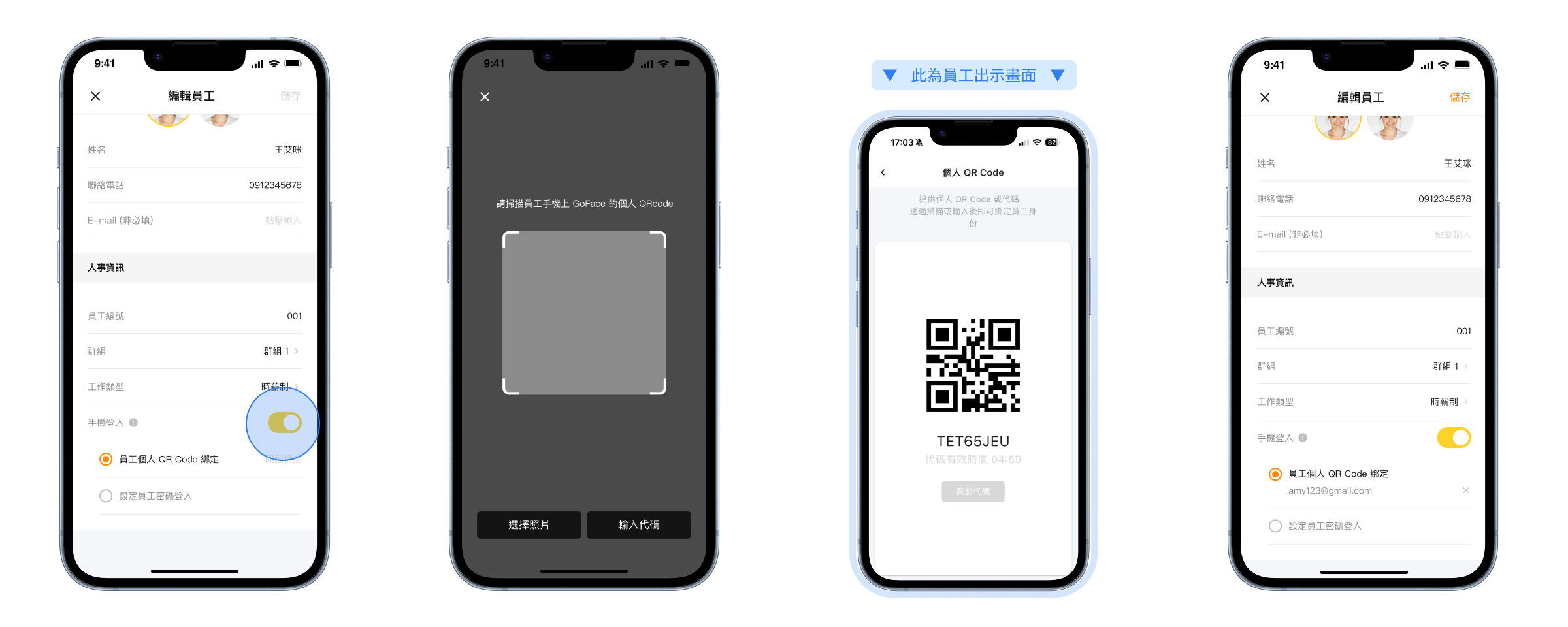 若需開啟員工 [手機登入] 功能,請掃描員工個人 QR Code 完成綁定